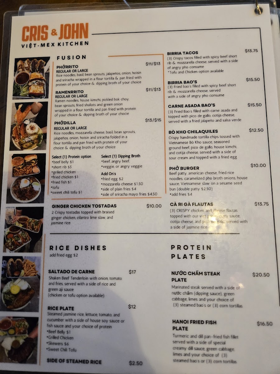 The menu at Cris and John offers a thoughtful blend of Vietnamese classics and Asian fusion dishes, presenting casual bites and comforting flavors in a relaxed setting. It’s the kind of place where you can enjoy everything from crispy Birria Tacos and spicy Bang Bang Wings to warming noodle bowls and rich, aromatic broth-based dishes.